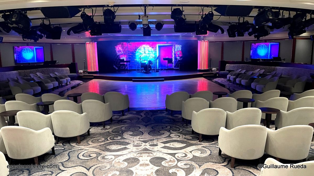 Avec sa scène centrale et son ambiance feutrée, il accueille en soirée les spectacles d’artistes talentueux. Chanteurs, danseurs et musiciens s’y produisent en live avec un véritable orchestre. La taille intimiste de la salle crée une vraie proximité. On se sent d’autant plus privilégié lorsque les artistes viennent saluer chaque passager à la fin des shows.