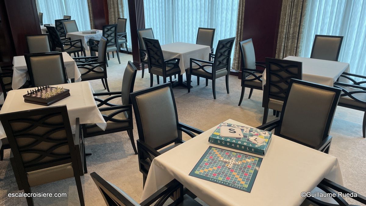 En plus des nombreux livres disponibles, la bibliothèque est aussi l’endroit où les passagers peuvent trouver grilles de mots croisés, sudoku ou encore le célèbre « Scavenger Hunt » : un petit livret de plus de 100 photos de détails cachés du navire qu’il s’agit de localiser tout au long de la croisière. Un jeu aussi ludique qu’addictif, qui permet en fin de croisière de remporter de jolies lots au logo de la compagnie.