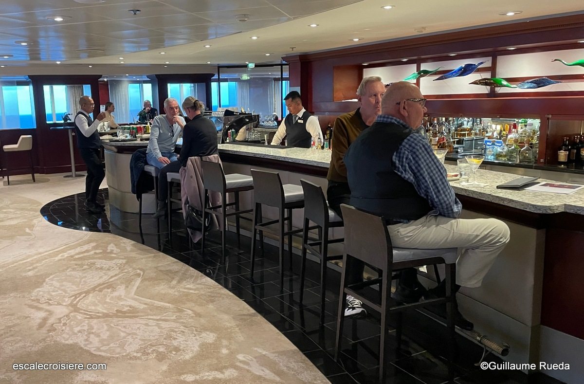 Situé à la proue du navire, ce salon cosy offre une vue imprenable sur l’Océan. En journée c’est ici que les activités sont organisées : quiz, jeux de lancer de sacs (cornhole), mini-golf improvisé… Chaque animation mentionnée avec un astérisque dans le journal de bord permet de collecter des tampons qui peuvent être transformés en souvenirs au logo de la compagnie en fin de croisière : stylos, t-shirts, chaussettes, sacs, lunettes, porte-clés…