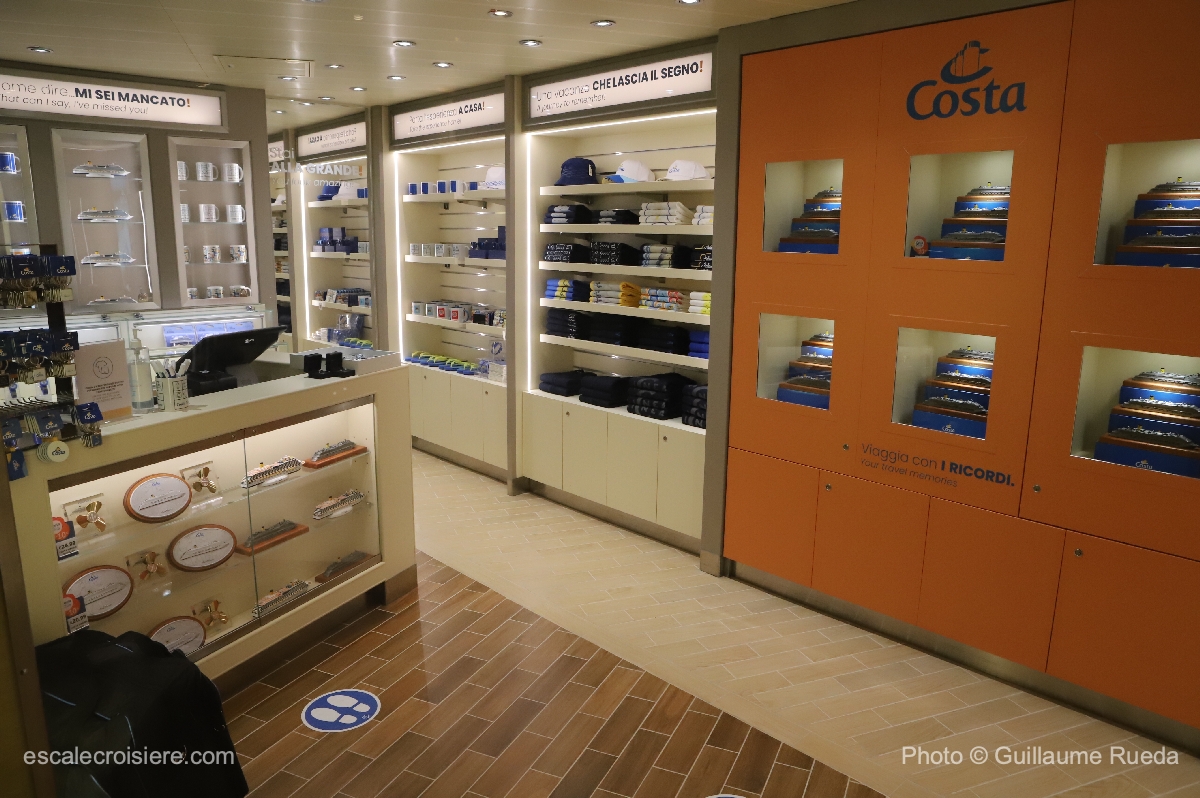 Un espace photo permet d’acheter les clichés pris à bord par les photographes du navire (pont 5). En enregistrant une photo de soi sur l’application Costa pour Smarphone, grâce à la reconnaissance faciale, les photos personnelles sont trouvées automatiquement. On peut alors les visualiser sur des bornes accessibles 24h/24 ou encore sur son téléphone avant d’aller chercher les tirages à la boutique.