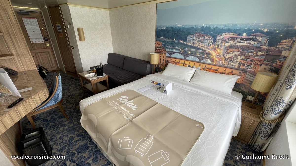 Les cabines du Costa Firenze se distinguent par leur style et leurs couleurs qui rappellent celles de la Renaissance florentine. Les matériaux raffinés et le mobilier reflètent le mode de vie à l’italienne. Comme sur tous les navires Costa on trouve des cabines intérieures, des cabines vue mer (sans balcon), des cabines avec balcon mais aussi des cabines avec de très jolies terrasses qui donnent sur le pont 5.