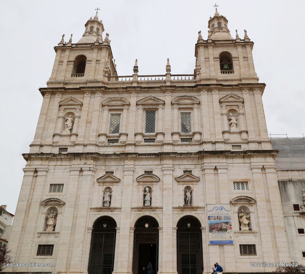 Le Monastère de Saint-Vincent de Fora, Mosteiro de São Vicente de Fora, domine le quartier de l’Alfama. Fondé au XIIe siècle puis entièrement reconstruit à partir de la fin du XVIe siècle, il est dédié à saint Vincent de Saragosse, saint patron de la ville. Son nom « de Fora » rappelle qu’il était à l’origine situé hors des murailles médiévales. À l’intérieur, de vastes cloîtres recouverts d’azulejos bleu et blanc racontent des épisodes historiques, dont le siège de Lisbonne, mais aussi des scènes plus inattendues tirées des fables de La Fontaine.