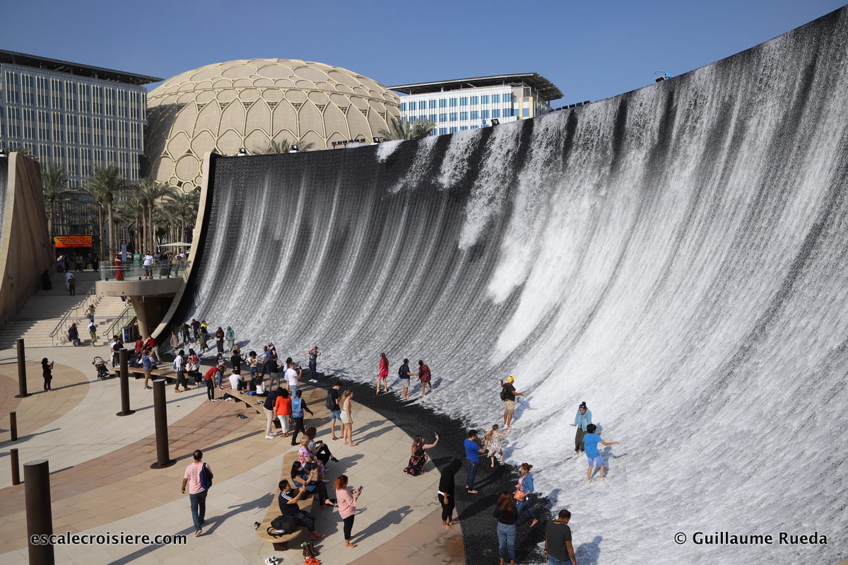 Water feature est une cascade circulaire qui offre un spectacle musical auxquels les visiteurs peuvent « participer » en se rafraîchissant les pieds pour les reposer des grandes marches effectuées pour visiter le monde de l’Expo 2020 Dubai.