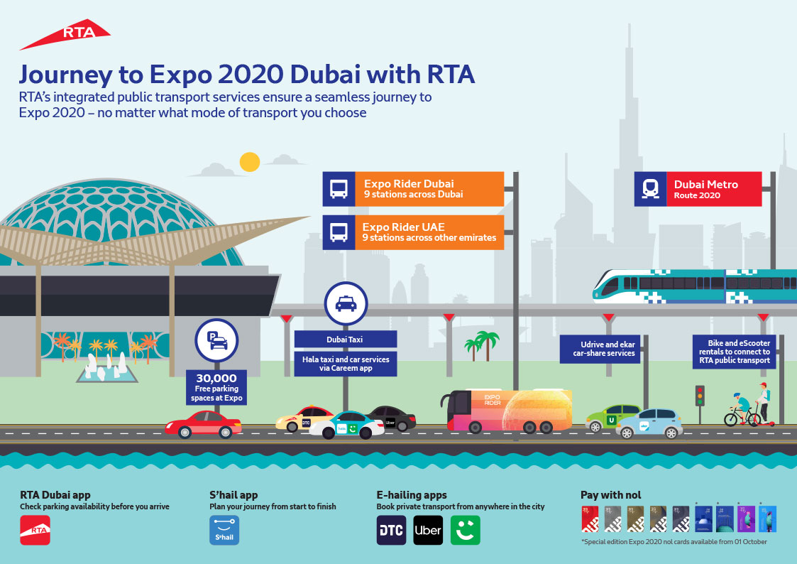 Des bus gratuits (Expo Rider) permettent également de faire le trajet depuis/vers les autres Émirats.