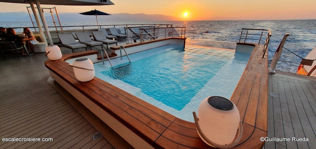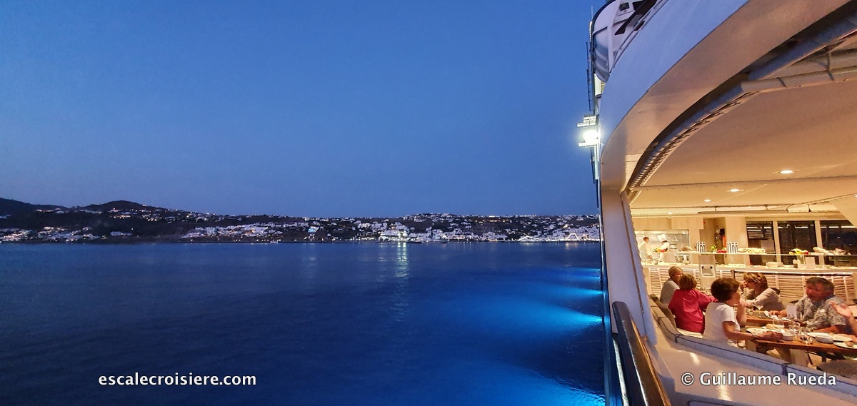 Le navire quitte Ajaccio, les îles Sanguinaires qui disparaissent lentement à l’horizon. Le soleil décline, baignant la côte d’une lumière dorée. Un temps idéal pour un dîner en extérieur sur le pont. L’expérience du Grill est très conviviale. On peut choisir entre un service à l’assiette ou la cuisson de viande ou poisson à la plancha, directement à table. C’est un délice. Un service en rotation permet à chacun de profiter de repas à ciel ouvert.