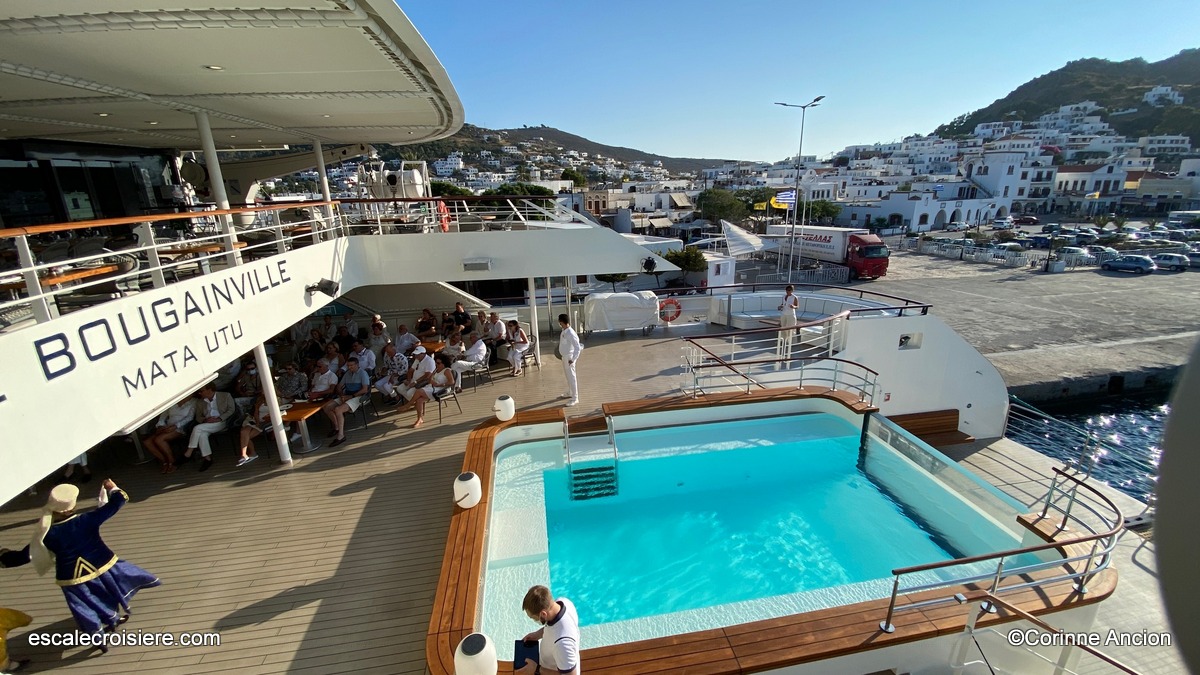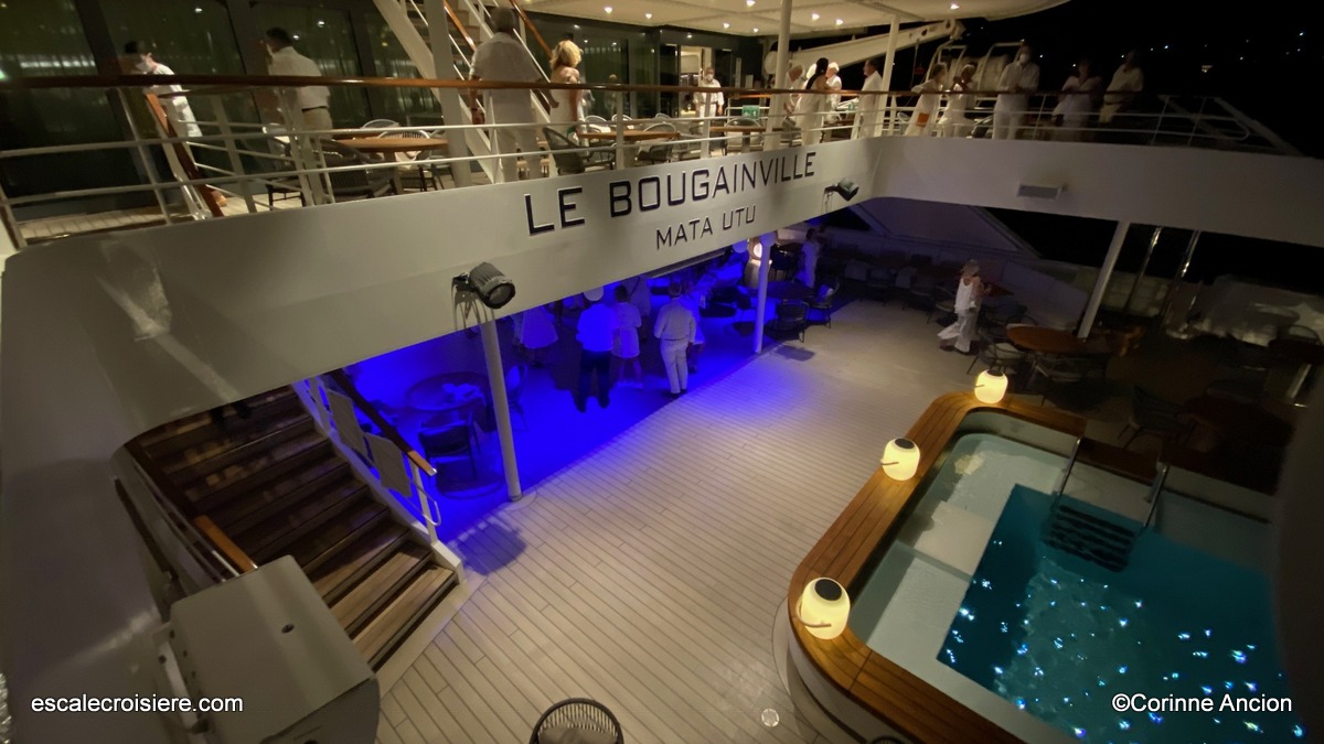 Ce soir, c’est un cocktail en musique sur le pont supérieur qui marque le départ de La Belle des Océans. Lors du point d’information quotidien, un changement de programme est annoncé : en raison de conditions météorologiques agitées dans les bouches de Bonifacio, l’escale prévue dans la cité perchée est remplacée par une nuit supplémentaire à Porto-Vecchio. Le programme reste inchangé avec seulement une vingtaine de minutes de trajets en car depuis Porto-Vecchio.