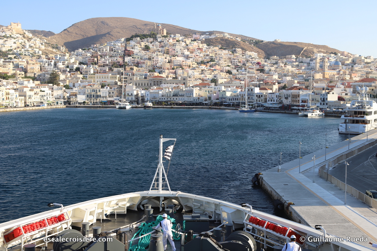 Le paquebot quittant le port à 11h30, le mieux est d’arriver la veille pour ne pas risquer de manquer le départ du bateau. Cela me permet d’arriver sereinement au port. Depuis l’aéroport, les taxis ont des prix fixes vers Le Pirée et Athènes. Il y a un peu moins de 50 km entre l’aéroport et le port mais le trafic est variable, il faut donc mieux être prévoyant. Je n’indiquerai pas le tarif ici car il est susceptible d’évoluer d’année en année mais je vous invite à regarder sur le site de l’office de tourisme ou de l’aéroport.