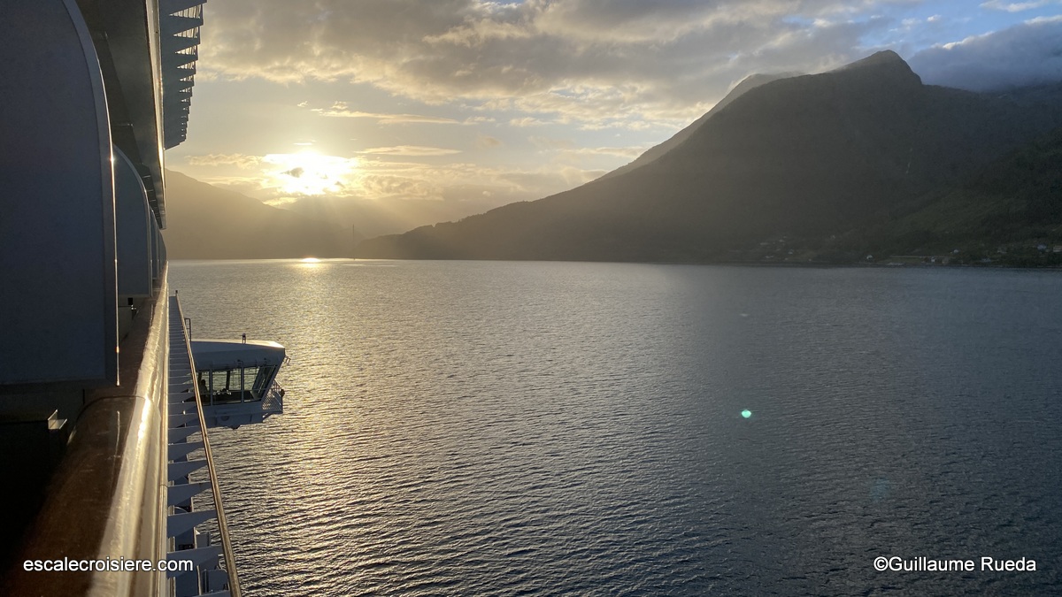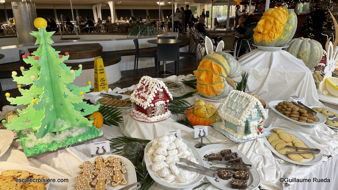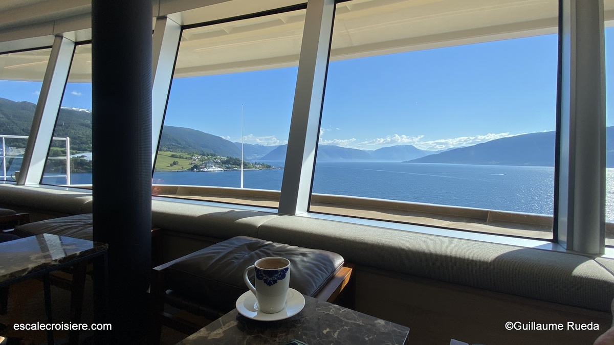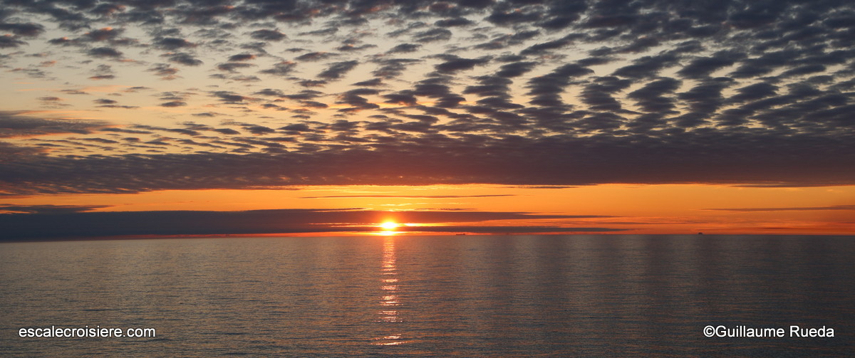 Ce matin, nous sommes en navigation. La terrasse du restaurant est idéale pour prendre son petit déjeuner face à la mer. En plus des petits pains et viennoiseries, la carte du petit déjeuner offre un grand choix : pain perdu, gaufres, pancakes, œufs aux plats, à la coque, Bénédicte avec saumon, bacon… charcuteries, fromages ou encore yaourts accompagnés de fruits frais, smoothie du jour…