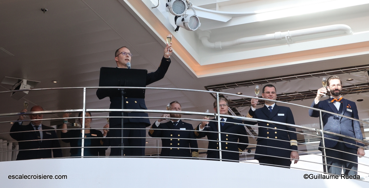 Ce soir, l’équipage nous est présenté lors du cocktail qui précède le dîner. Les officiers se font un point d’honneur à trinquer avec chaque passager en leur adressant un petit mot de bienvenue.