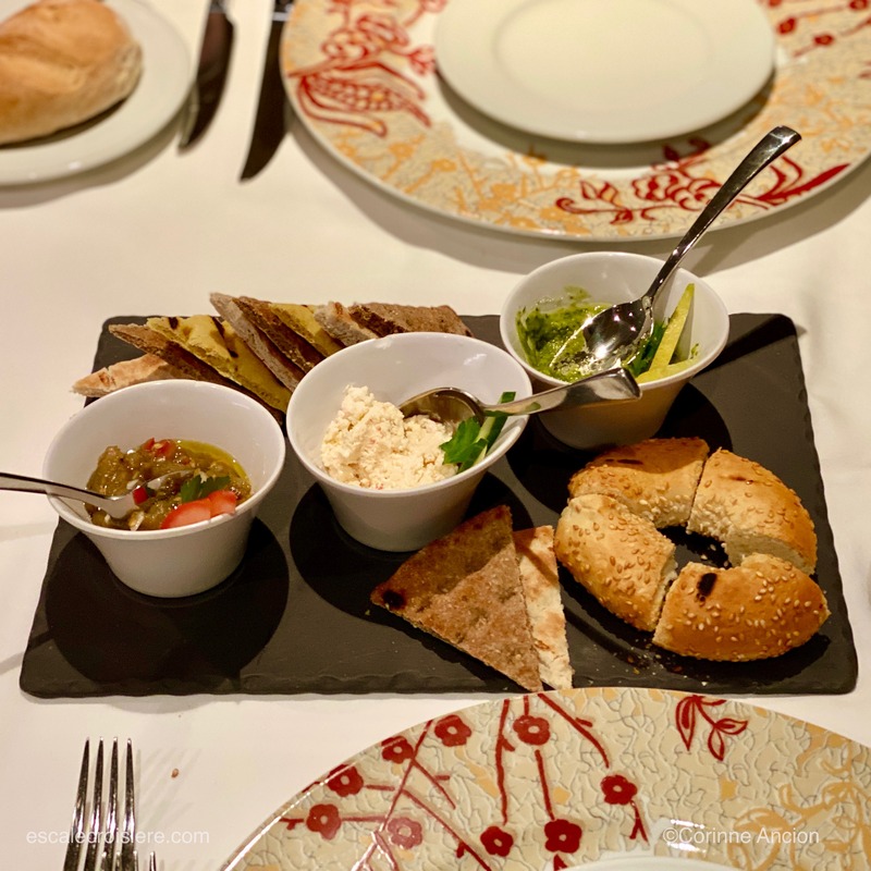 - Sélection de dips et pains spéciaux : pain Pita et pain Simit aux graines de sésame que l’on tartine de Syros Maintanosalata (pesto aux câpres et aux herbes), Kopanisti aux tomates rôties et Caviar d’aubergines fumées.