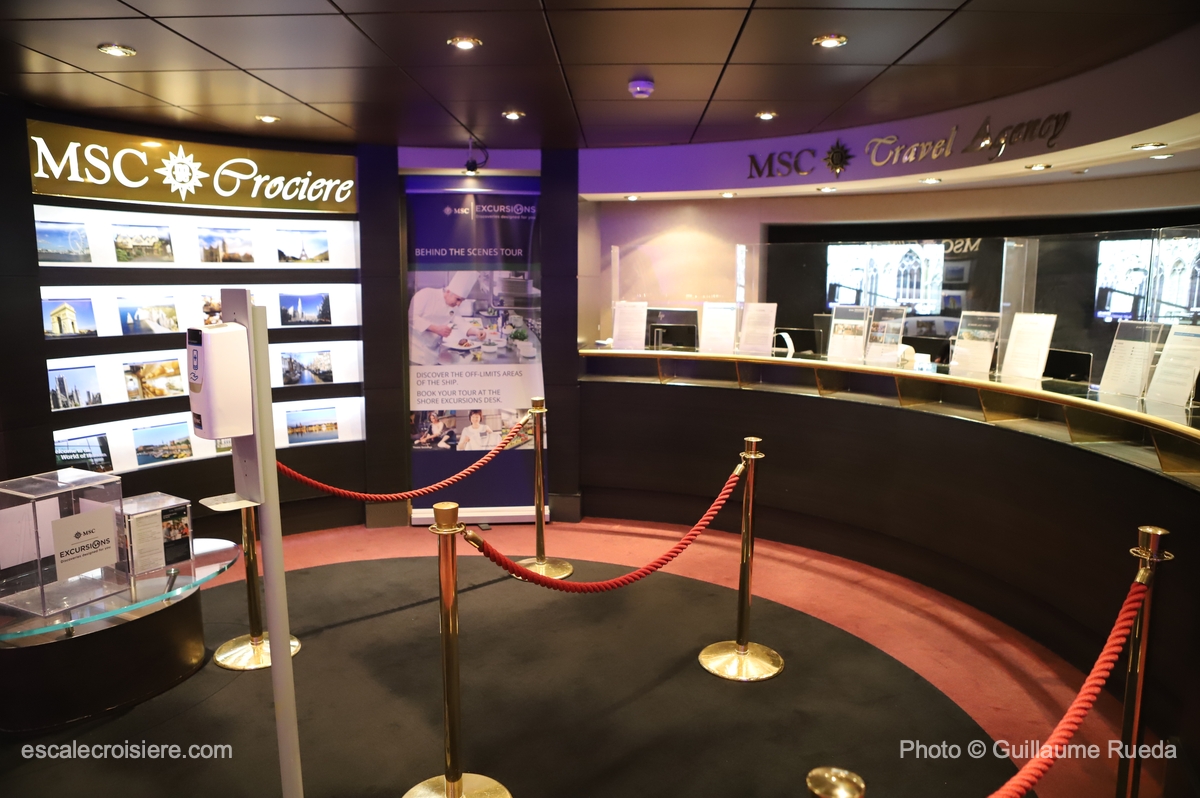Le bureau des excursions est une véritable agence de voyage on vient y chercher des informations sur les activités proposées en escale. On peut aussi y organiser un programme sur mesure avec réservation de taxis ou location de véhicule pour un programme personnalisé. Le Tour Magazine y est disponible, cette brochure présente l’ensemble des excursions de chaque escale. Si vous avez réservé des excursions directement sur Internet avant votre départ, vos tickets vous seront directement remis dans votre cabine au plus tard la veille de l’excursion. On trouve également dans cette zone des bornes d’enregistrement pour la cruise card. Elle permet de créditer la carte et/ou d’associer sa carte bancaire à pour les paiements à bord.
