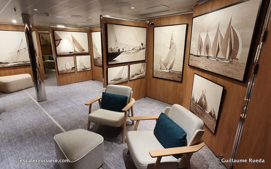 Ce salon se trouve juste au-dessus de la passerelle et offre une vue panoramique. Dans cet espace détente on trouve un bar, un coin bibliothèque avec livres et jeux de société ainsi qu’une terrasse panoramique qui offre la même vue qu’en passerelle et d’où l’on peut voir la proue du navire et les manœuvres.