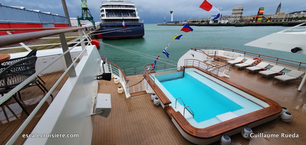 La piscine à vision panoramique est dotée d’un système de nage à contre-courant. Des transats sont disposés autour de la piscine au pont 3 ainsi qu’au solarium du pont 7 près du Spa.