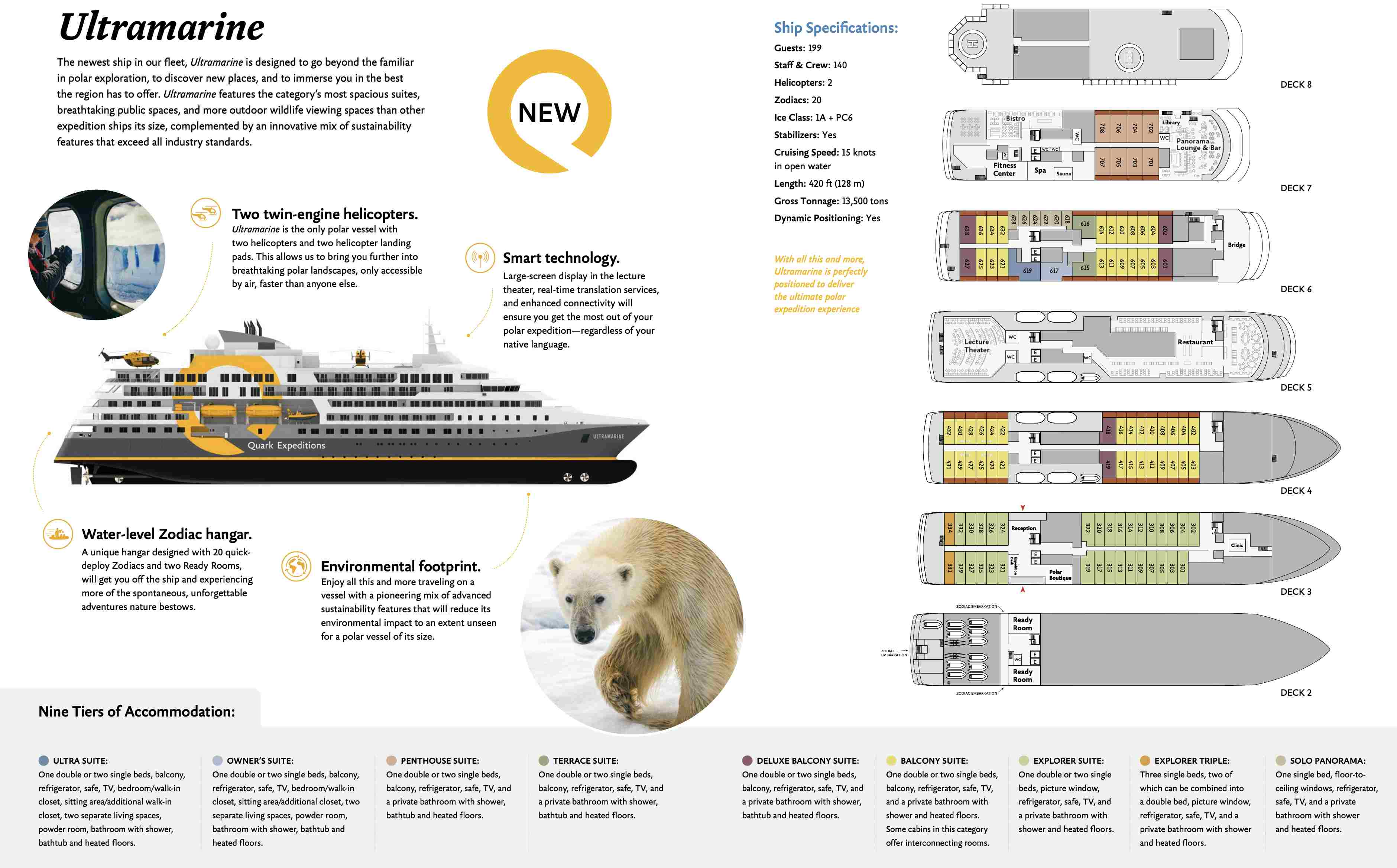 Conformément à la stratégie « Promesse Polaire » récemment dévoilée par Quark Expeditions, l’Ultramarine inclura des fonctionnalités techniques qui minimiseront l’empreinte environnementale du navire de manière inédite pour un bateau de cette taille. Il inclura également des innovations respectueuses de l’environnement telles que le positionnement dynamique, qui permet d’éviter de jeter l’ancre dans les zones sensibles des fonds marins.