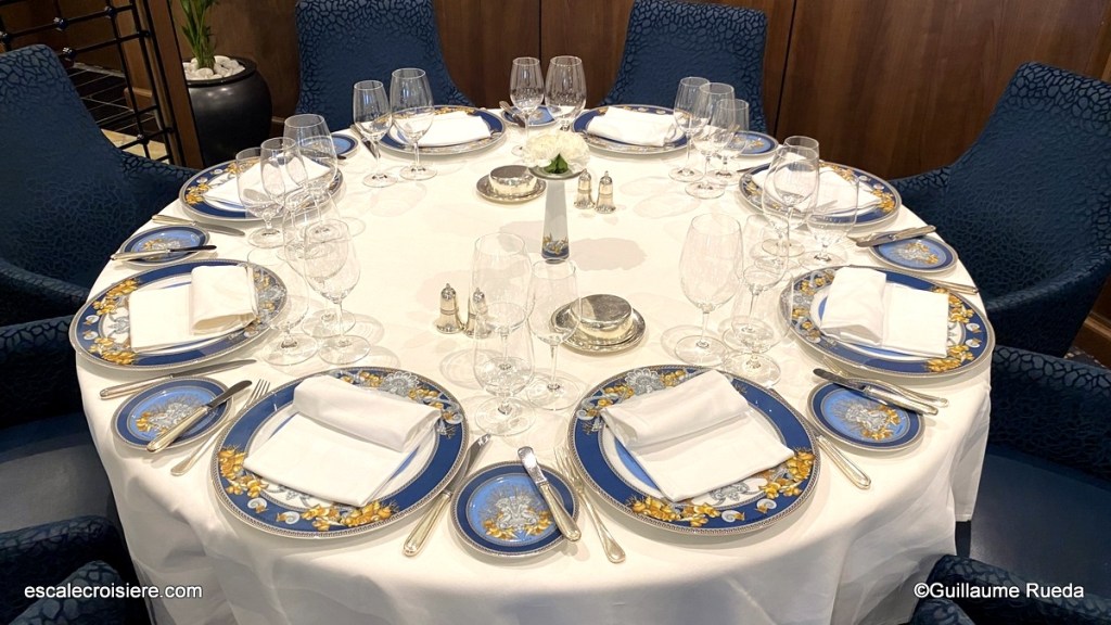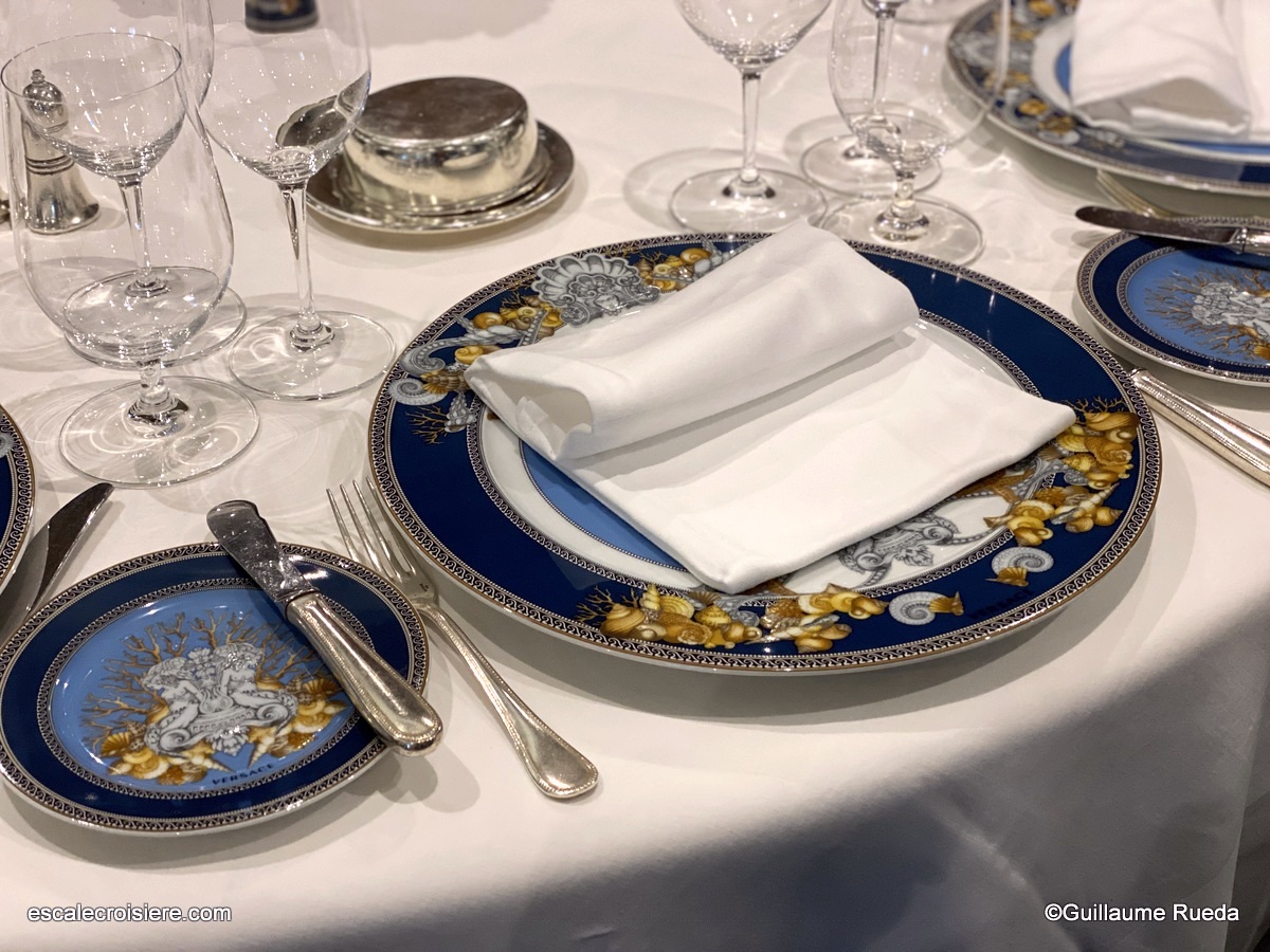 Tous les restaurants sont sans supplément de prix mais il est nécessaire de réserver certains d’entre eux qui sont très prisés. La vaisselle des restaurants gastronomiques est signée Versace. Elle a été dessinée spécialement pour les navires de la compagnie qui a investi un budget de $500 000 rien que pour le service de table. L’assiette « standard » de certains restaurants coûte $250, le service « or » voit le prix de l’assiette grimper à $475.