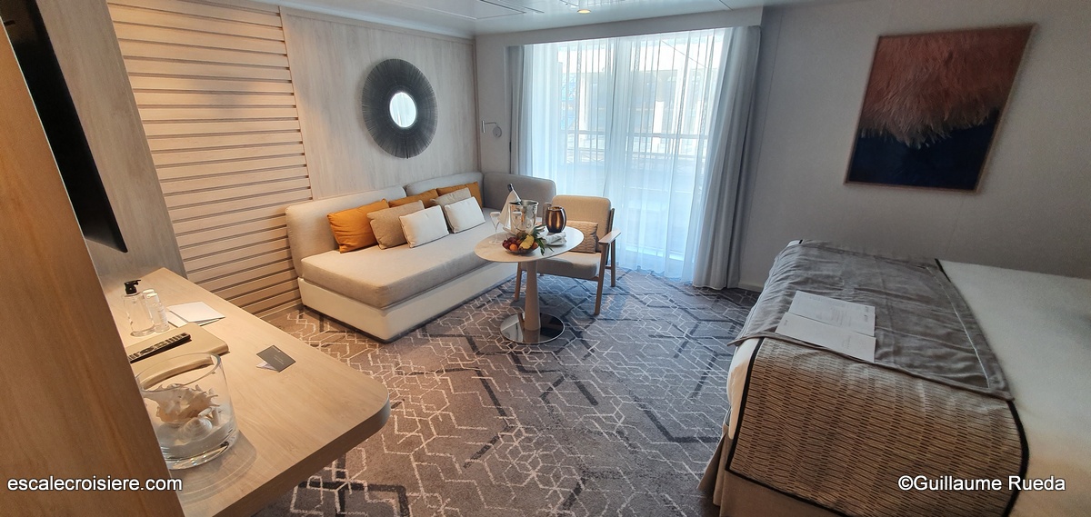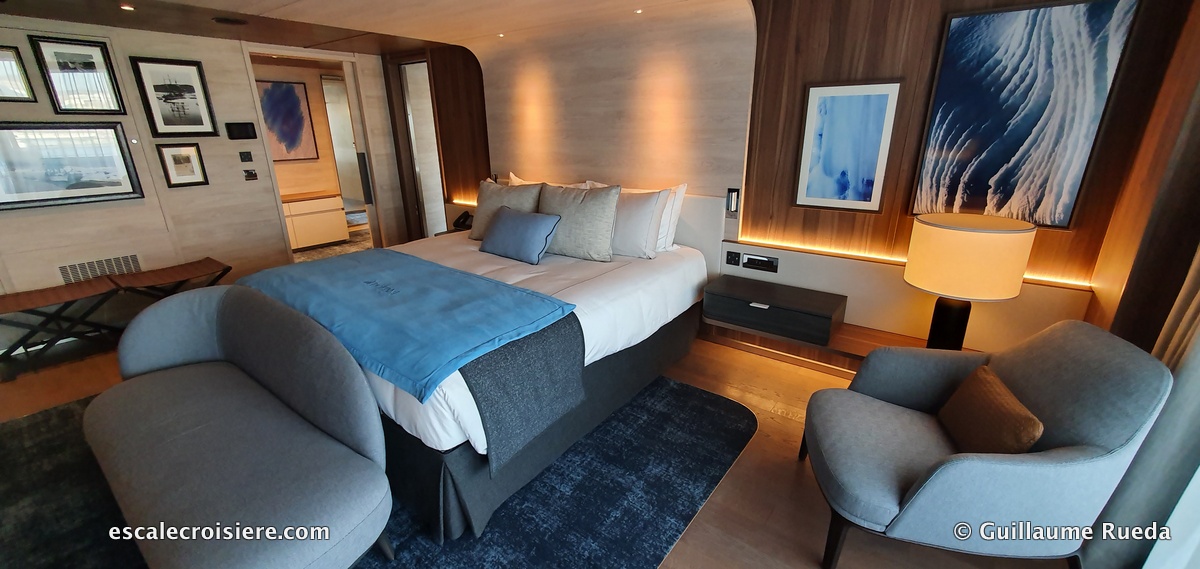 Cette suite de 45 m2 est équipée avec un grand dressing, un grand salon avec canapé et fauteuil, une grande terrasse de 30 m2 avec transats, jacuzzi, un espace pour pouvoir prendre son petit déjeuner dehors et d’une salle de bain avec douche et baignoire de balnéothérapie ainsi que deux WC séparés. Parmi les accessoires pratiques disponibles en cabine, on peut noter : l’écran de télé qui descend du plafond au-dessus du lit en plus de la télé du salon, des prises USB de chaque côté du lit + des prises de courant (d’autres prises électriques européennes et US sont disponibles près du bureau et dans le dressing), sèche-cheveux, kits manucure et de toilette (cotons, cotons tige, lime à ongle, marque de prestige pour le gel douche, shampoing, après-shampoing, crème pour le corps et savon, brosse à vêtement, kit de couture, gant pour nettoyer les chaussures, parapluies.