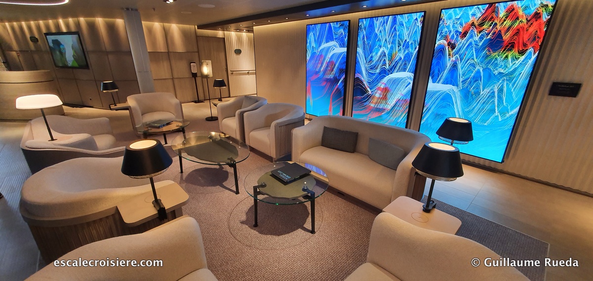 Le salon se trouve juste sous la passerelle et offre ainsi la même vue que le commandant. Ce piano bar dispose d’une terrasse panoramique. Au centre, un écran permet de suivre la navigation sur une carte électronique. Dans cet espace détente on trouve une bibliothèque, des tables de jeux et quelques postes Internet.