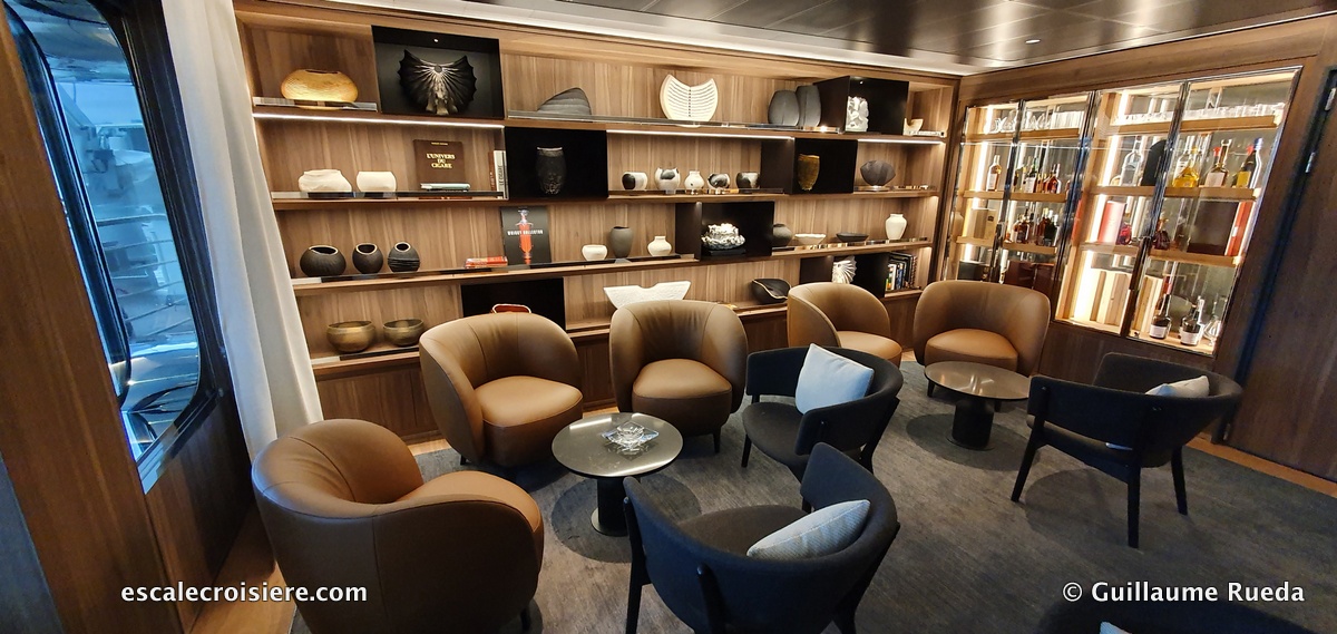 Ce salon se trouve juste au-dessus de la passerelle et offre une vue panoramique. Dans cet espace détente on trouve un bar, un coin bibliothèque avec livres et jeux de société ainsi qu’une terrasse panoramique qui offre la même vue qu’en passerelle et d’où l’on peut voir la proue du navire et les manœuvres.