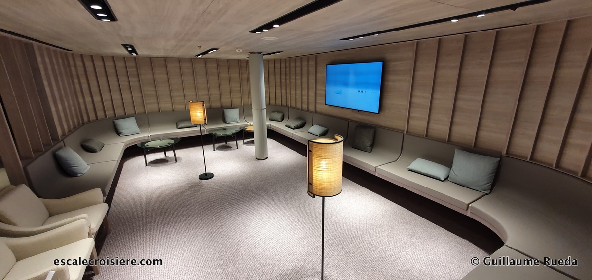 Cet espace de convivialité situé au pont 5 est à la fois un lieu d’échange et de partage. On y trouve un petit salon qui se transforme en espace enfants et des ordinateurs moderne pour voir les photos prises en escale et à bord.