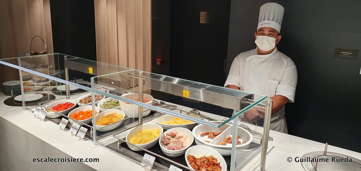 À l’arrière se trouve le restaurant du pont 4. On peut prendre ses repas à l’intérieur ou en terrasse selon la météo. Le service à table est irréprochable avec un personnel attentionné et toujours soucieux du détail. Le service du petit déjeuner est sous forme de buffet.