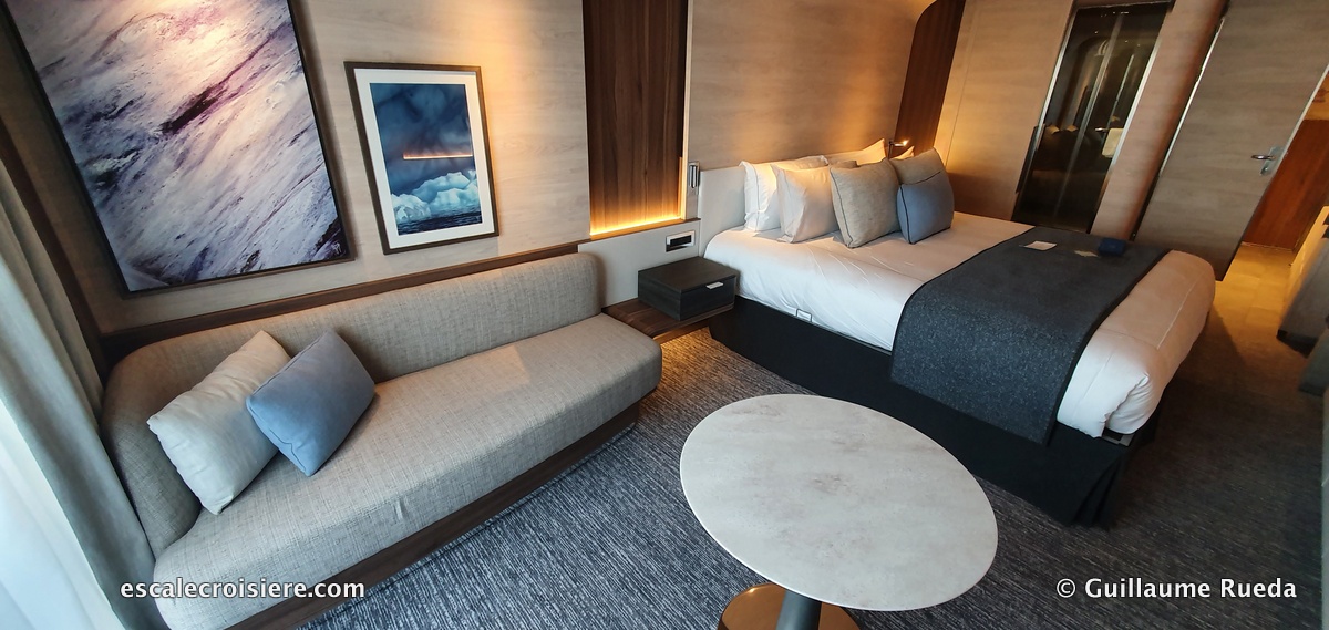 Cette suite de 45 m2 est équipée avec un grand dressing, un grand salon avec canapé et fauteuil, une grande terrasse de 30 m2 avec transats, jacuzzi, un espace pour pouvoir prendre son petit déjeuner dehors et d’une salle de bain avec douche et baignoire de balnéothérapie ainsi que deux WC séparés. Parmi les accessoires pratiques disponibles en cabine, on peut noter : l’écran de télé qui descend du plafond au-dessus du lit en plus de la télé du salon, un autre écran de télé caché dans un miroir pour regarder la télé depuis la baignoire, des prises USB de chaque côté du lit + des prises de courant (d’autres prises électriques européennes et US sont disponibles près du bureau et dans le dressing), sèche-cheveux, kits manucure et de toilette (cotons, cotons tige, lime à ongle, marque de prestige pour le gel douche, shampoing, après-shampoing, crème pour le corps et savon, brosse à vêtement, kit de couture, gant pour nettoyer les chaussures, parapluies.
