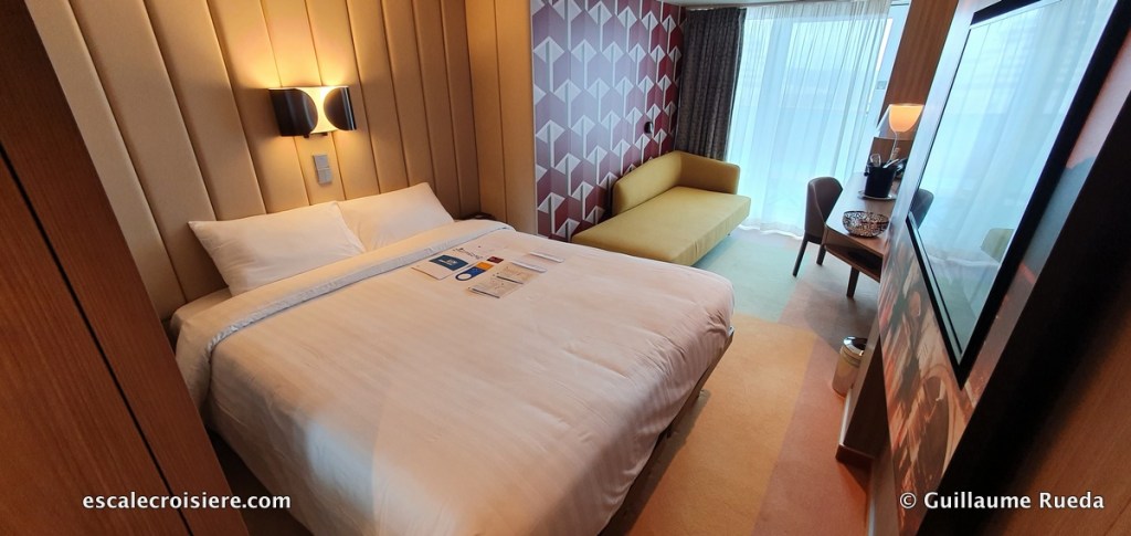 Dès que l’on entre dans la cabine, on peut voir un grand « tableau photographique », avec télévision incorporée, représentant un panorama d’une célèbre ville italienne. La salle de bain arborent un style singulier et fantasque, avec des murs rappelant le marbre et une fenêtre pleine hauteur dans la douche qui apporte de la luminosité ainsi qu’une jolie vue sur la mer.