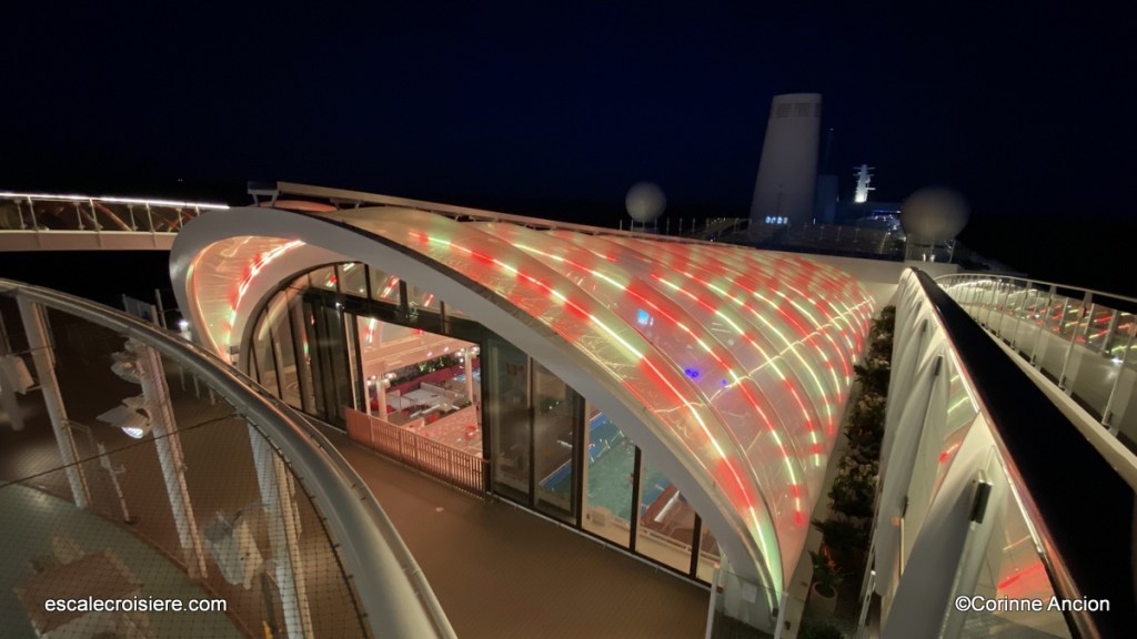 C’est sur ce pont à plancher de verre situé au pont 18 que se retrouvent les passagers pour admirer le coucher du soleil. La vue sur l’océan y est imprenable.