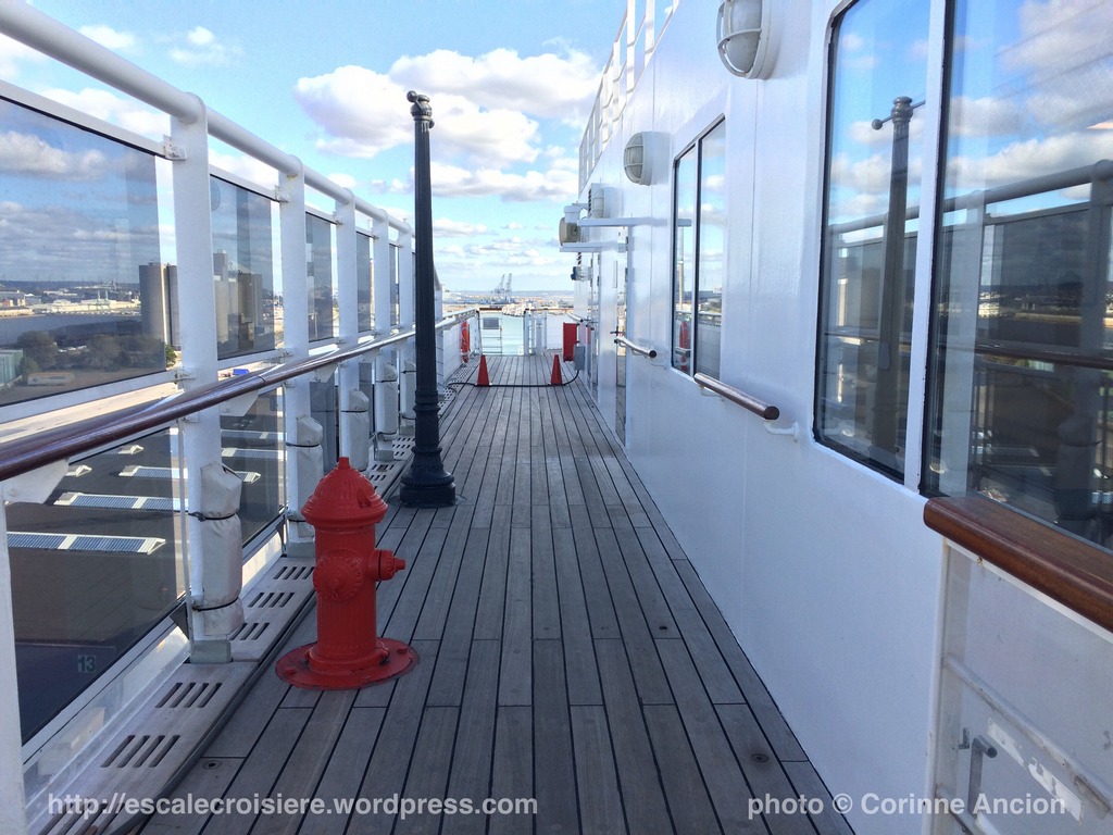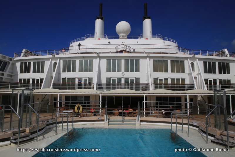 Petit déjeuner au buffet, tour dans les boutiques et repos au solarium rythment la matinée. A 12h Chris Wells, le commandant nous souhaite la bienvenue à bord et fait le point sur la navigation. Son second fait un point sur notre position ainsi que sur la météo. Tout au long de la traversée, ce moment très attendu permet à la fois aux passagers de s’informer sur l’itinéraire mais aussi de prendre connaissance de l’avancement de la traversée.