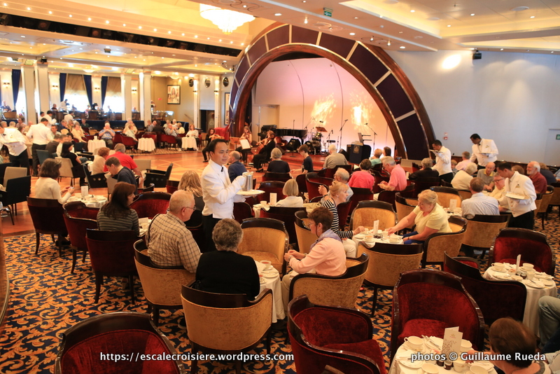 C’est le restaurant principal du paquebot (1 347 couverts). C’est très certainement l’une des salles les plus remarquables jamais conçues à bord d’un navire. D’une largeur égale à celle du paquebot et d’une hauteur de presque trois étages, cette salle de restaurant est répartie sur deux niveaux. Pour l’anecdote, l’historique paquebot Britannia de la Cunard pourrait tenir dans ce restaurant qui d’ailleurs porte son nom. Le Britannia est ouvert pour le petit déjeuner, le déjeuner et pour le dîner avec deux services. L’horaire se choisit au moment de la réservation.