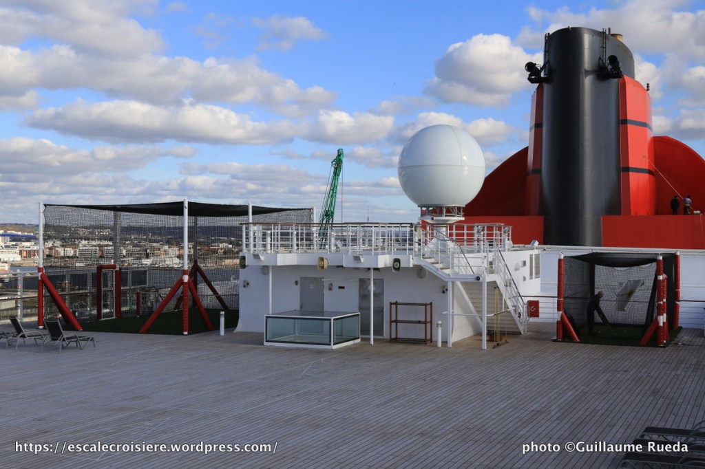 Les installations sportives situées à plus de 65 mètres au-dessus de la ligne de flottaison comprennent un practice de golf, un jeu d’anneaux, des shuffleboards (jeu de palets) et un mini-tennis.